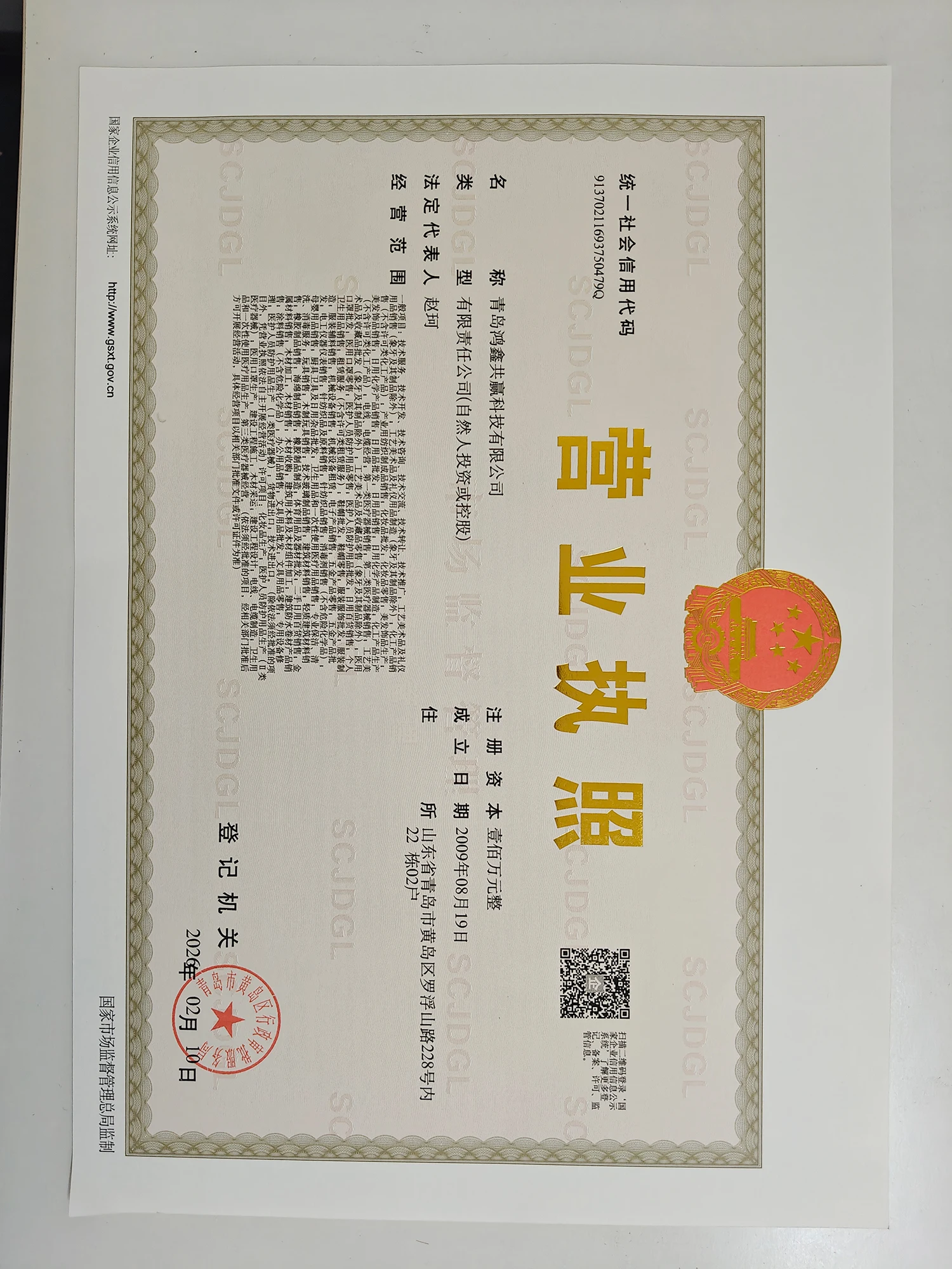 Registered address : Room 02, Building 22, No. 228 Luofushan Road Qingdao Shandong China
